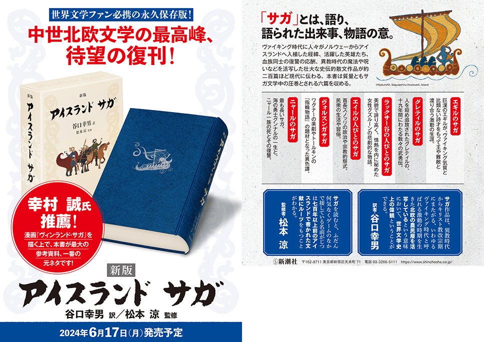 「サガ」とは、語り、語られた出来事、物語の意で、ヴァイキング時代の9〜10世紀に人々がノルウェーからアイスランドへ入植した経緯、活躍した英雄、血族同士の復讐の応酬、異教時代の魔法や呪いなどを活写した壮大な史伝的散文作品が200篇ほど伝わっています。本書は北欧文学研究者の谷口幸男氏が、その中から圧巻とされる6篇を選んで古アイスランド語から直接に翻訳し、『アイスランド サガ』として1979年に刊行された旧版をもとに、監修者による訳文の点検や文字拡大を施し、新たに図版・系図・地図・文献案内を加えた「新版」としての復刊です。長らく入手困難だった「幻の名著」がついに蘇ります!