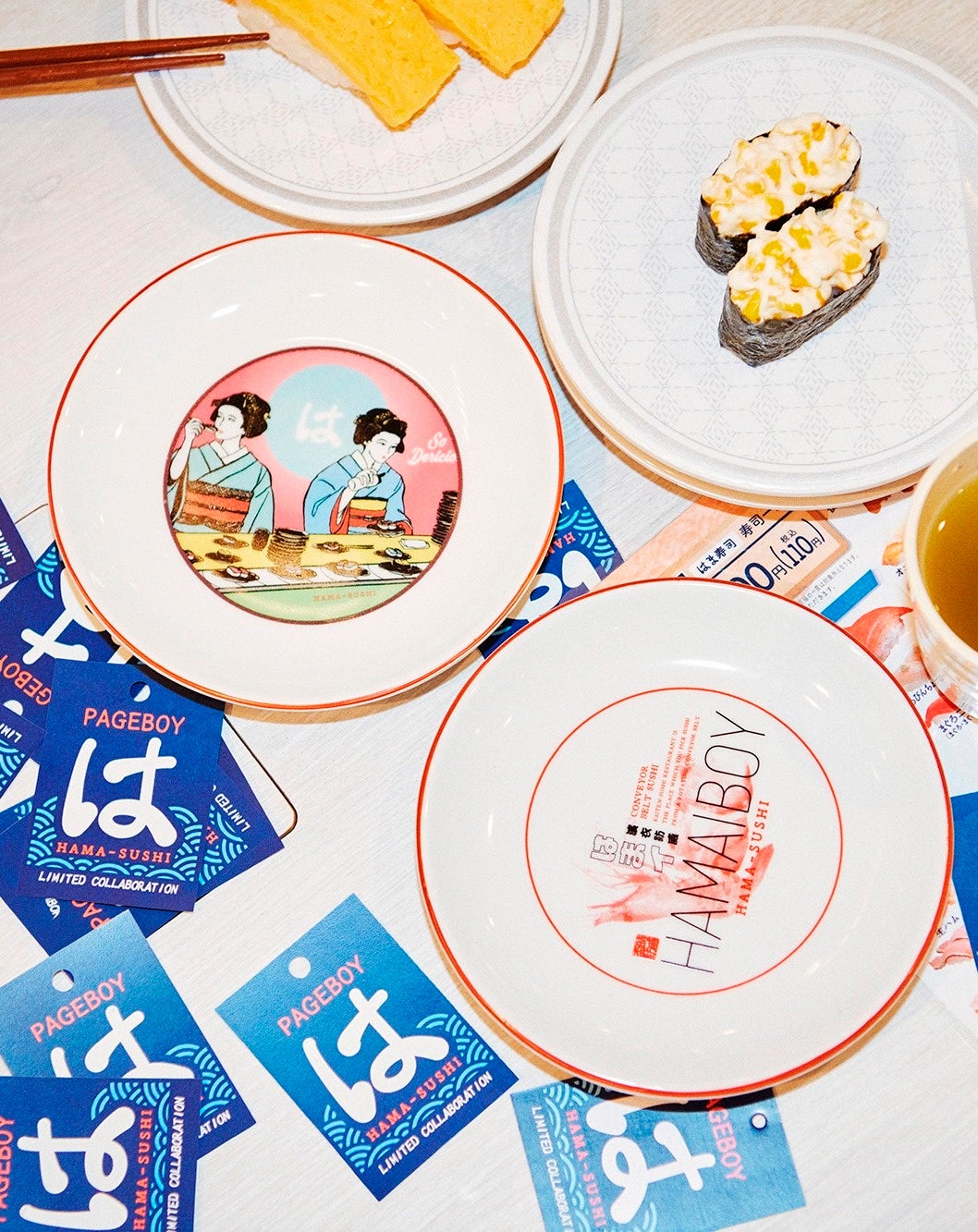 腕やバックプリントがポイントのロンT・Tシャツを初め、はま寿司ならではの波柄をモチーフにしたシャツもインパクト抜群。ユニセックスブランドPAGEBOYLIMも同時コラボレーションし、メンズが着用可能なロンTもご用意しています。また、今回のコラボレーションをきっかけにブランドとして初めて食器を手掛けました。ビビットな絵柄やHAMABOYのロゴがモードっぽいオリジナルコラボ小皿もお食事のお供にピッタリ。お寿司をテーマに和を取り入れたデザインはどれも存在感抜群です。いつものコーディネートに遊び心と新鮮さを演出してくれる、個性的で特別なお洒落が楽しめるアイテムをラインアップしました。また、はま寿司コラボTシャツ・ロンT・シャツをお買い上げの方には先着順でコラボレーションを記念したオリジナルノベルティBOXに入れてお渡しいたします(数量限定、無くなり次第終了です)。