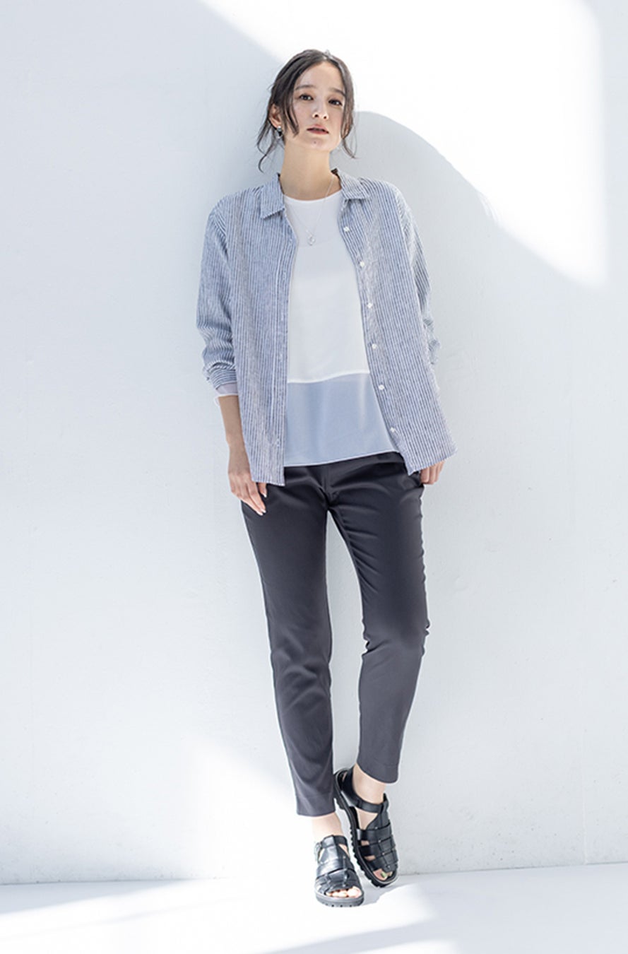 ・デザイン:リラックス感のあるはき心地ながら、微光沢と落ち感がある素材で上品さを兼ね備えたきれいめパンツ。お客様の声を元に、ウエストにタックを入れてお腹周りに少しゆとりをプラスしました。