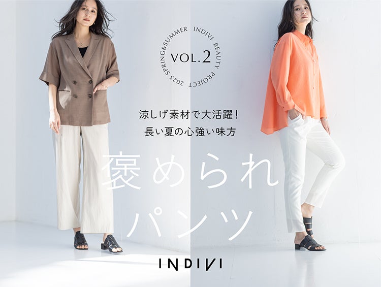 お客様の声を元に進化させたINDIVI(インディヴィ)の美脚パンツ「褒められパンツ」シリーズの今季第2弾は、美しいシルエットはそのままに軽くて涼しく快適なはき心地。これから迎える暑い季節を乗り切る強い味方になるパンツです。シルエットは「ワイド」、「テーパード」の2タイプをラインナップ。