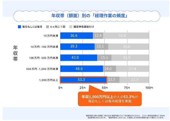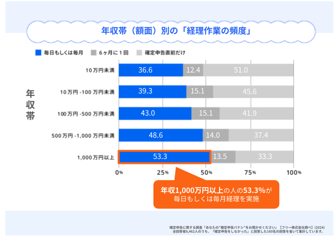 今回のアンケートで聞いた「年収帯(額面)」別に「経理作業の頻度」を見ると、年収の高い人ほど経理作業の頻度が高いという傾向も見られました。年収の高い人ほど、経理が必要な取引が発生する頻度等が高く、また、それによって普段から事業の経理状況を適切に把握できている可能性があります。