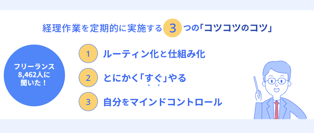 そこで、経理作業の頻度を「毎月」以上と答えた人に「コツコツのコツ」を聞き、freeeにて、多くの人が実践しているコツを3つにまとめました。結果、コツの1つめは「ルーティン化と仕組み化」、2つめは「とにかく「すぐ」やる」、3つめは「自分をマインドコントロール」となりました。