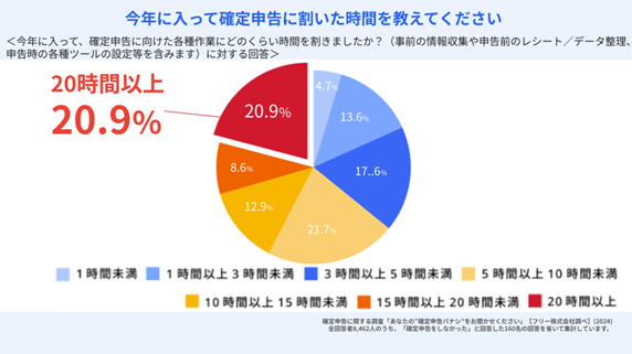 今年に入って確定申告にかかった作業時間について聞いたところ、2割の人が「20時間以上」と回答しました。