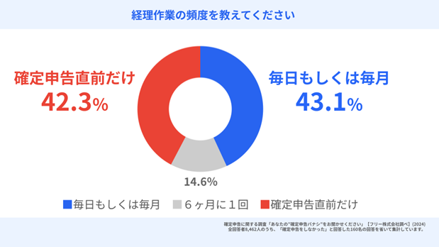 経理作業の頻度について聞いたところ、「確定申告直前だけ」と回答した人が約4割いる一方で、「毎日」または「毎月」と回答した人も約4割いる結果となり、どちらも同程度存在することが分かりました。
