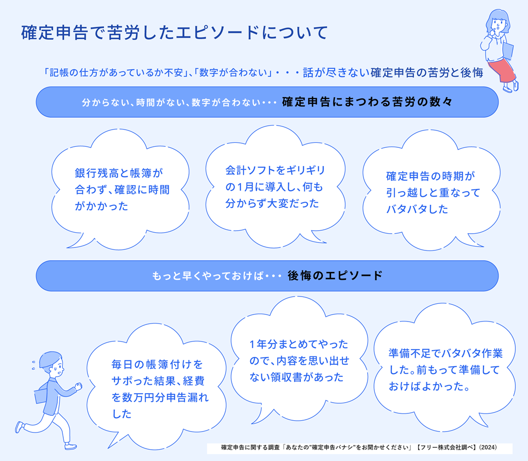 確定申告の頻度が少ない(半年に1回以下)と回答した人に、具体的な確定申告で苦労したエピソードについても聞きました。その結果、「銀行残高と帳簿が合わず、確認に時間がかかった」という声や、「毎日の帳簿付けをサボった結果、経費を数万円分申告漏れした」等の回答が集まりました。