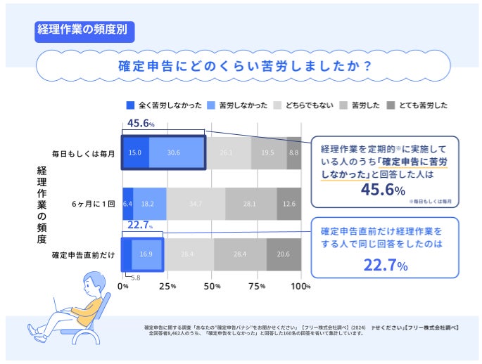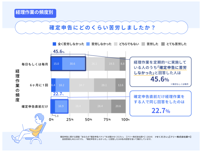 さらに、経理作業の頻度別に「確定申告の苦労度合い」についても見てみると、経理作業の頻度が高いほど「(確定申告に)苦労しなかった」という結果となりました。毎日もしくは毎月経理作業をしている人の45.6%が、「全く苦労しなかった」、または「苦労しなかった」と回答しました。