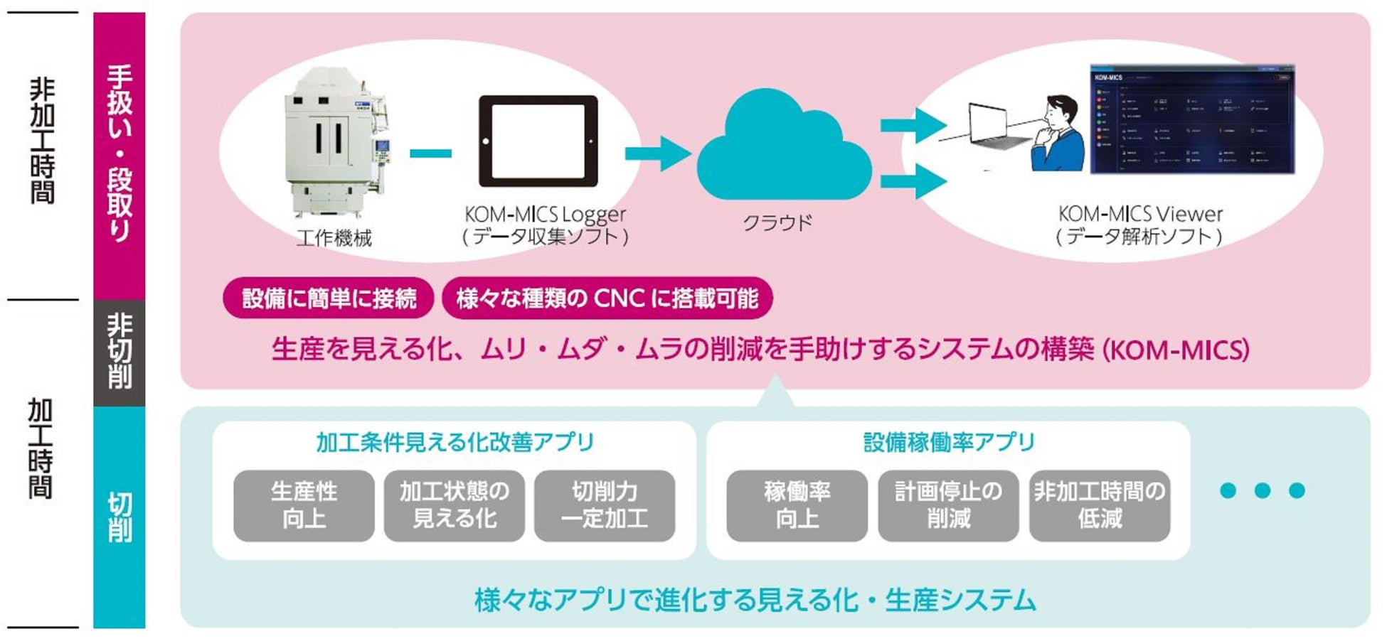 「KOM-MICS」は、工場に設置されている工作機械などの生産設備からデータを収集し工場の現状を見える化することで、生産現場の問題点の洗い出しや改善、品質および生産性の向上を支援するシステムです。