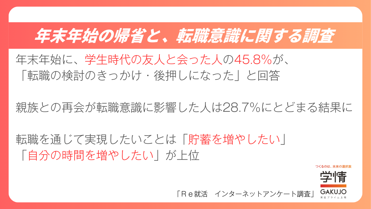 株式会社学情は、20代の求職者を対象に「年末年始の帰省と転職」をテーマとしたインターネットアンケートを実施しました。調査の結果、学生時代の友人と年末年始に会った人のうち45.8%が「転職の検討のきっかけや後押しになった」と回答しました。一方、親族と会ったことが転職意識に影響した人は28.7%にとどまりました。また、転職を通じて実現したいこととしては、「貯蓄を増やしたい」「自分の時間を増やしたい」といった回答が上位となりました。