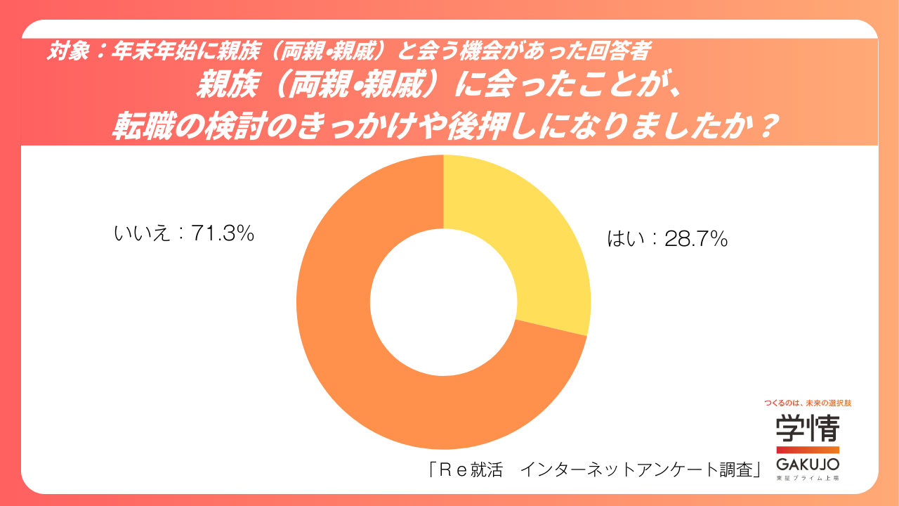 年末年始に親族と会った人のうち、「転職の検討のきっかけや後押しになった」と回答したのは28.7%にとどまりました。