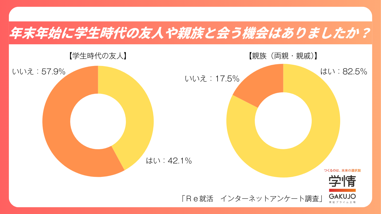 また学生時代の友人と会う機会があった人42.1%、年末年始に親族(両親・親戚)と会う機会があった人は82.5%でした。