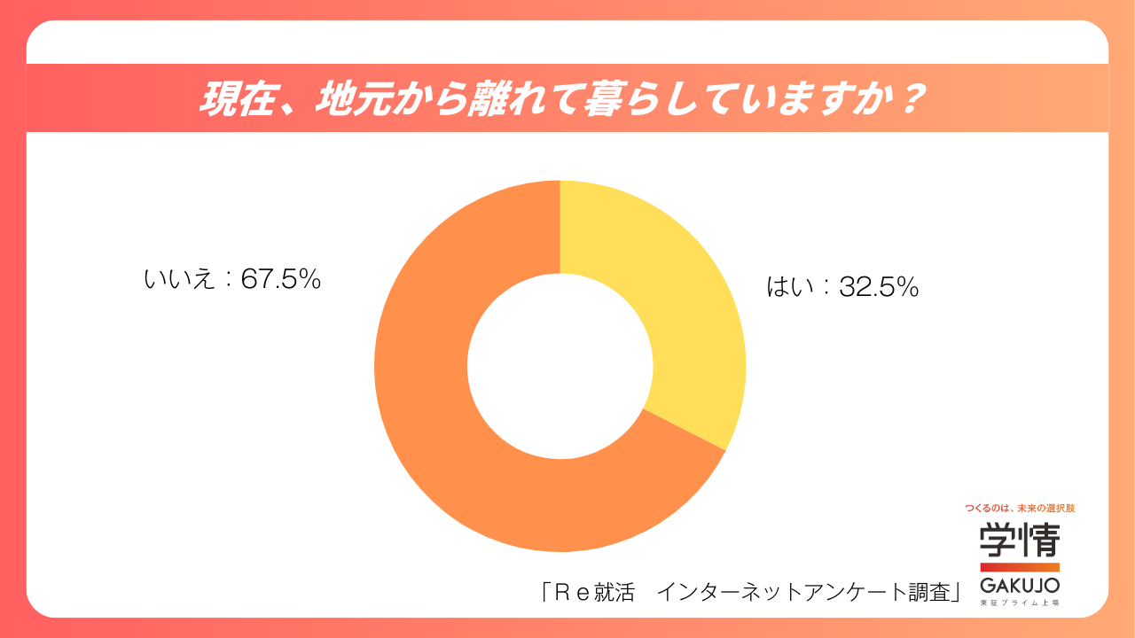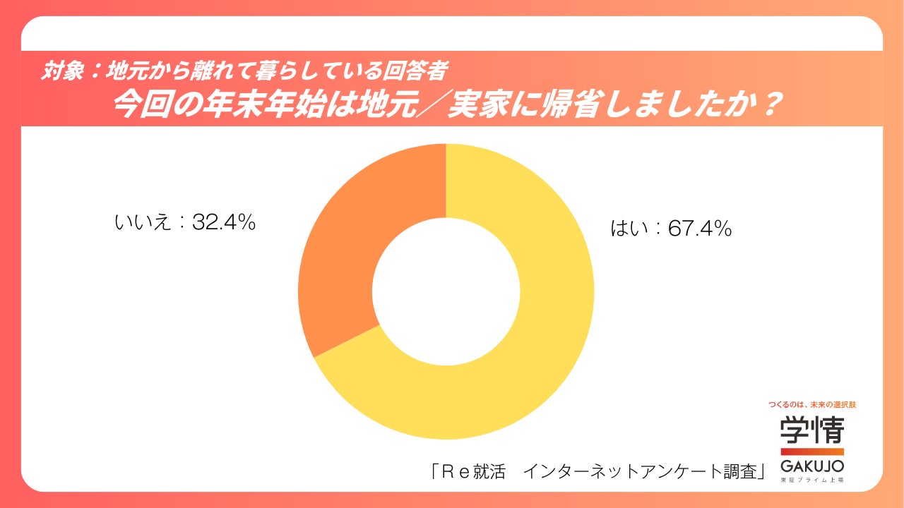 現在、地元から離れて暮らしていると回答した人は32.5%でした。そのうち、今回の年末年始に地元や実家へ帰省した人は67.4%となっています。一方、全体の67.5%は地元で生活していると回答しました。