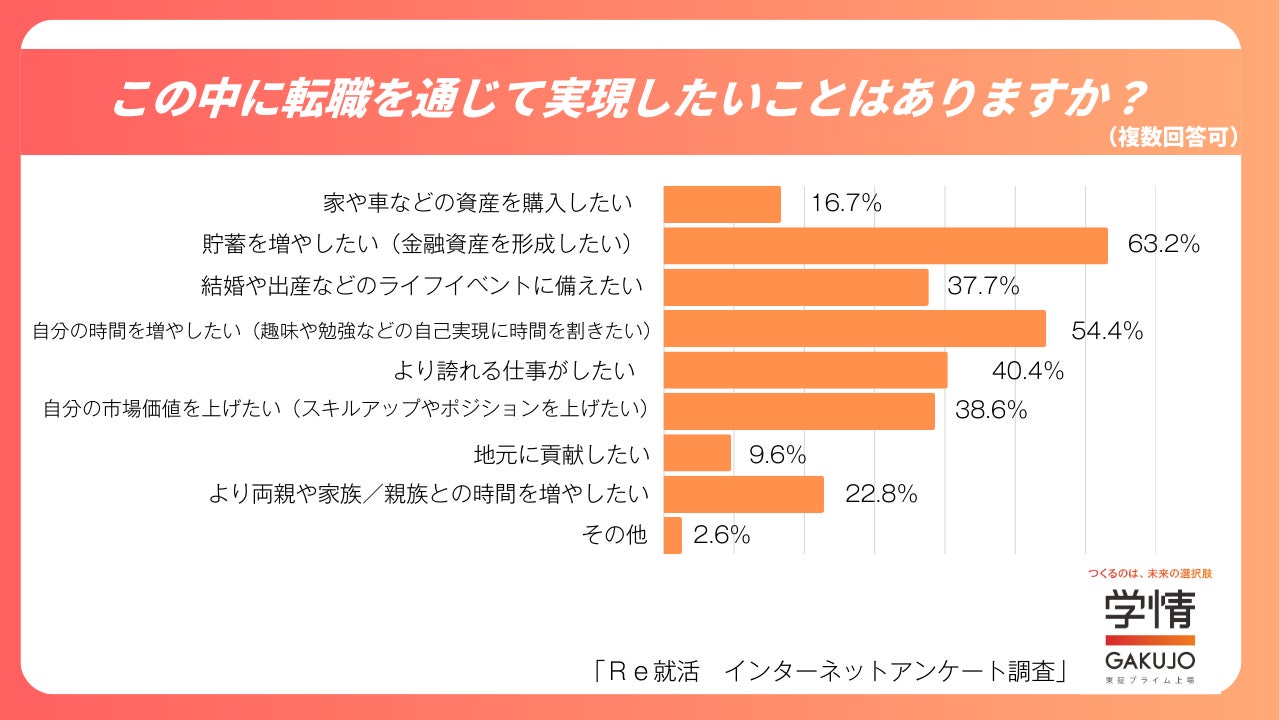 転職を通じて実現したいこととして最も多かったのは、「貯蓄を増やしたい(金融資産を形成したい)」(63.2%)でした。次いで、「自分の時間を増やしたい(趣味や勉強などの自己実現に時間を割きたい)」(54.4%)、「より誇れる仕事がしたい」(40.4%)が挙げられました。