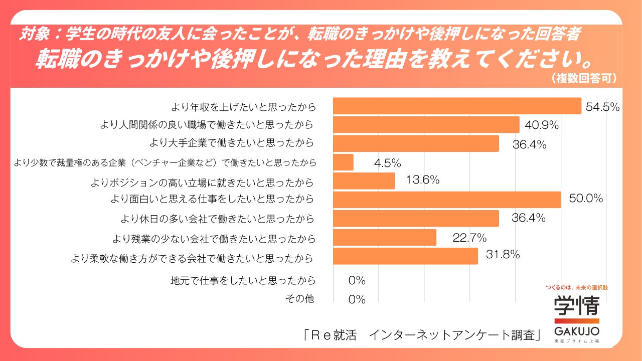 転職のきっかけや後押しになった理由として、最も多かったのは「より年収を上げたいと思ったから」(54.5%)でした。次いで、「より面白いと思える仕事をしたいと思ったから」(50.0%)、「より人間関係の良い職場で働きたいと思ったから」(40.9%)が続きました。