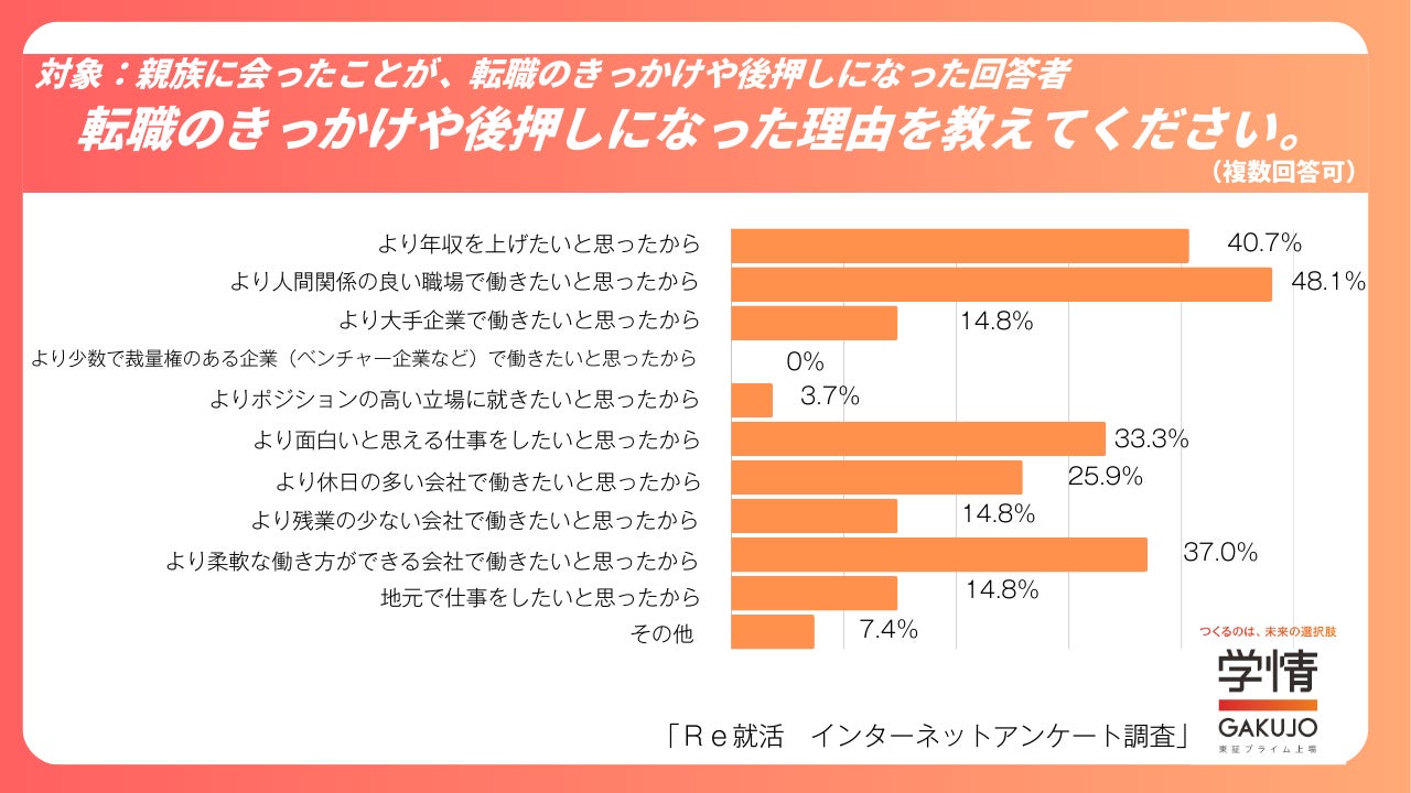 転職のきっかけや後押しになった理由として、「より人間関係の良い職場で働きたいと思ったから」(48.1%)が最も多く、「より年収を上げたいと思ったから」(40.7%)、「より柔軟な働き方ができる会社で働きたいと思ったから」(37.0%)が上位となりました。