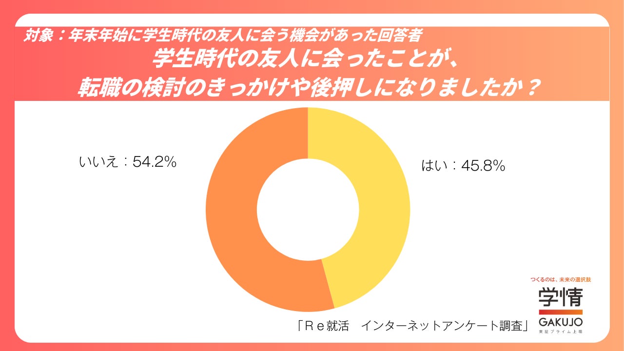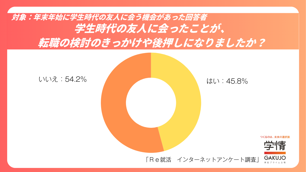 年末年始に学生時代の友人と会った人のうち、45.8%が「転職の検討のきっかけや後押しになった」と回答しました。一方、「影響はなかった」と回答した人は54.2%でした。
