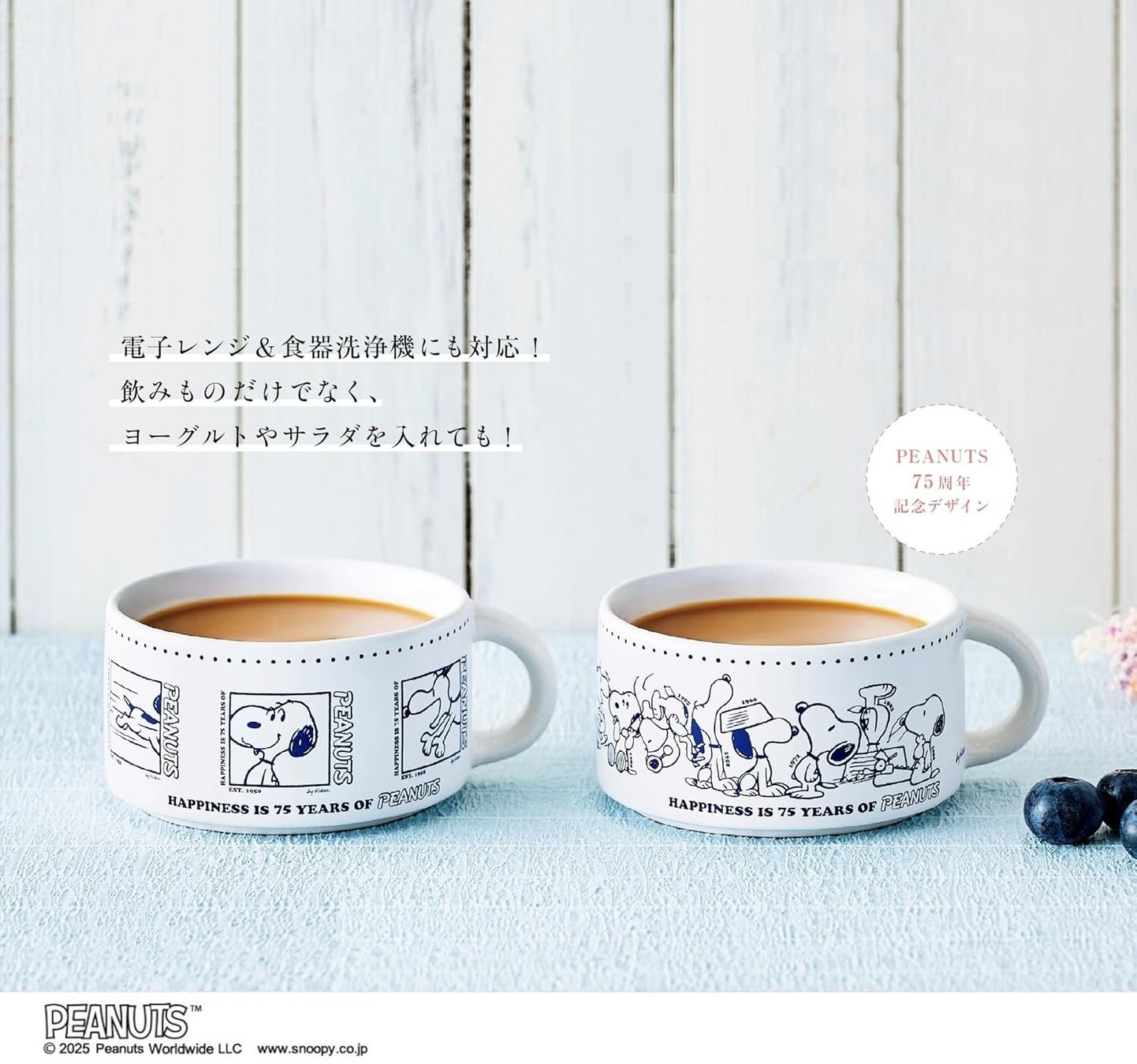 ひとつめのカップには、75周年記念アートより、1953年から2000年までの各年代のスヌーピーがずらりと並んでいます。もうひとつにも6つの年代のスヌーピーが!PEANUTSのこれまでの歴史を彩る歴代のスヌーピーが、表情豊かにあしらわれており、どちらも眺めているだけでもほんわか癒やされます。そして、口径が幅広に設計されているため、飲みものだけでなくヨーグルトやサラダを入れたり、小物入れとしてもぴったりです。