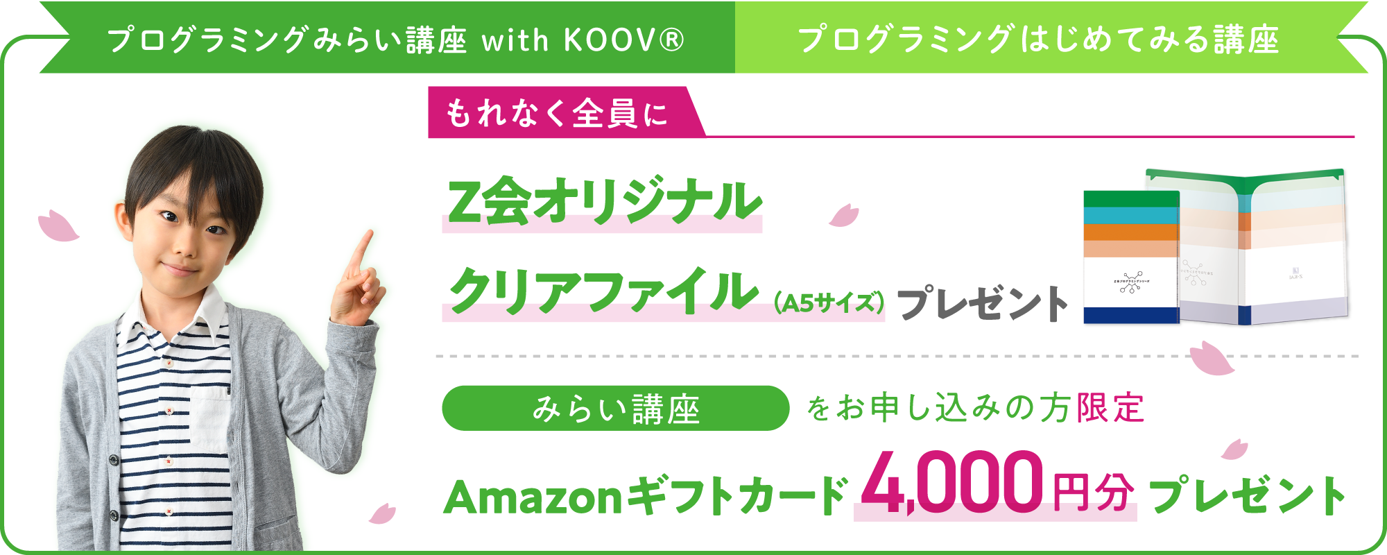 春に向けてプログラミング学習をスタートする小中学生を、Z会が全力応援!期間限定でおトクなキャンペーンを実施中です。ぜひこの機会にお申し込みください。