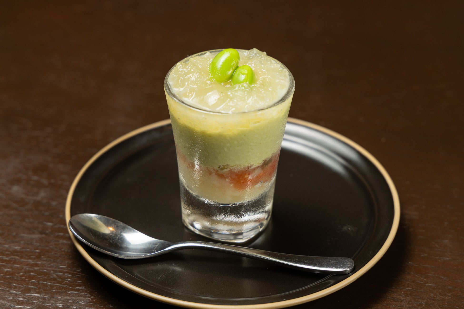 枝豆の様々な顔を合わせた、素材のうまみをダイレクトに感じるミルフィーユ仕立て。