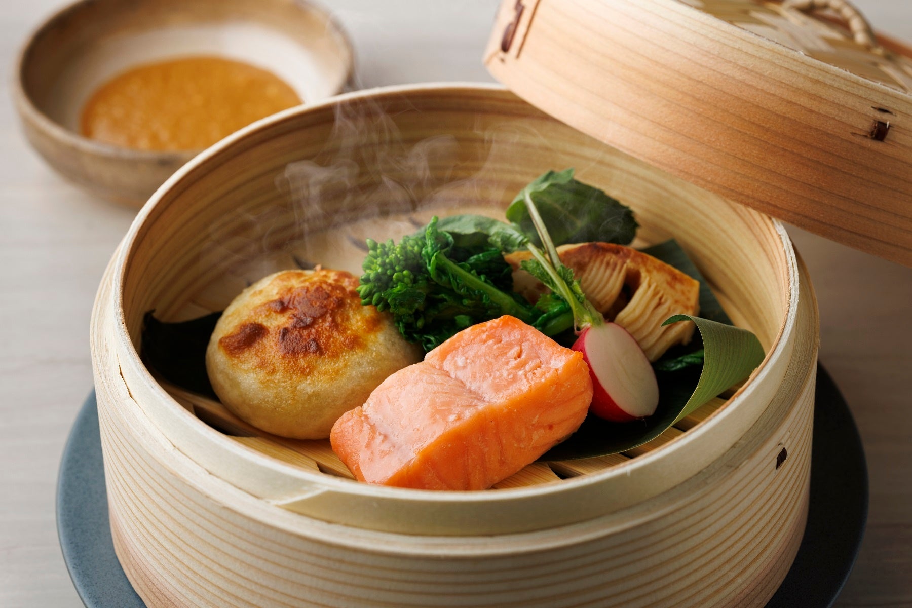 信州サーモンとおやきのせいろ蒸し ― 酒粕味噌ソース ―