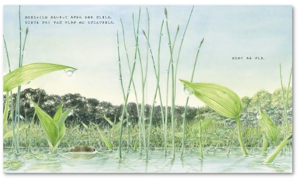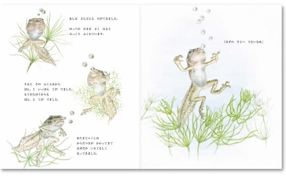 小学館児童出版文化賞受賞作家・たてのひろしと、生物画家・かわしまはるこが描く大人気絵本「3匹のあまがえるシリーズ」。三部作最後の物語となる本作では、かえるたちの「誕生」から「出会い」までの物語が描かれています。おたまじゃくしとして水の中に生まれた小さないのちが、かえるの姿に成長して水の外へと旅立っていくドラマを、精細な筆致で描き出したかわしまさんの作品はまさに圧巻。