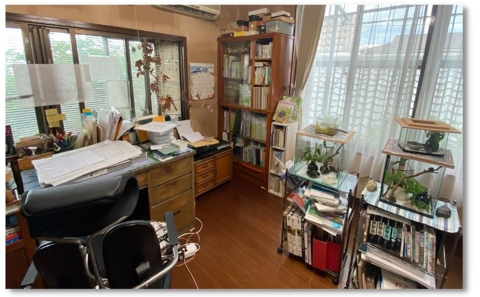 かわしまさんのアトリエには、かえるたちの飼育水槽がたくさん並んでいます。毎日のようにかえるたちの様子を観察し、スケッチを描きとめ、絵本制作のイメージづくりを続けてきたそうです。飼育下と自然環境下では生き物の行動は異なるため、自然の中でくらしているかえるたちの様子を見に、水田でのフィールド取材も何度も行ったといいます。かわしまさんが描くみずみずしい自然描写や生き物たちの豊かな表情は、そのような絶え間ない観察の日々から生まれているのです。