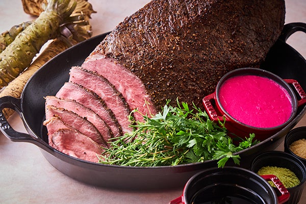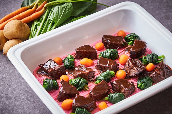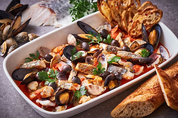 聖夜を彩る限定メニューでは、「クロスダイン」19年間のビュッフェ定番料理である「ジューシーローストビーフ低温調理 64℃仕上げ」を、贅沢に“和牛サーロイン”を使ってご提供いたします。きめ細かい霜降りが特徴で、適度にサシが入り肉の旨みを感じられるサーロインにゆっくりと熱を入れることで、より肉の旨みが溶け出したジューシーで柔らかな食感をお楽しみいただけます。長時間じっくり煮込むことによって柔らかくほろっとした食感を堪能いただける「special和牛ブラザート」は、北イタリア・ピエモンテ州の代表的な郷土料理です。にんじんやほうれん草、ビーツで色付けした鮮やかなマッシュポテトが料理に華を添えます。同じくイタリア・リヴォルノ発祥の料理「リヴォルノ風 鱈と魚介の『カッチェコ』」では、鱈をはじめムール貝、殻付きあさり、帆立貝などの魚介をふんだんに使用し、トマトを加えて煮込みました。魚介とトマトの濃厚な味を感じられる一品です。「カッチェコ」をホテル特製のバゲットに盛り付けて一緒に召し上がっていただくと、いろいろな素材の味が混ざりより美味しさが引き立ちます。スープは世界三大きのこの一つ“ポルチーニ茸”を使った、香り高く滑らかでクリーミーな味わいの「クリームスープ」をご賞味ください。
