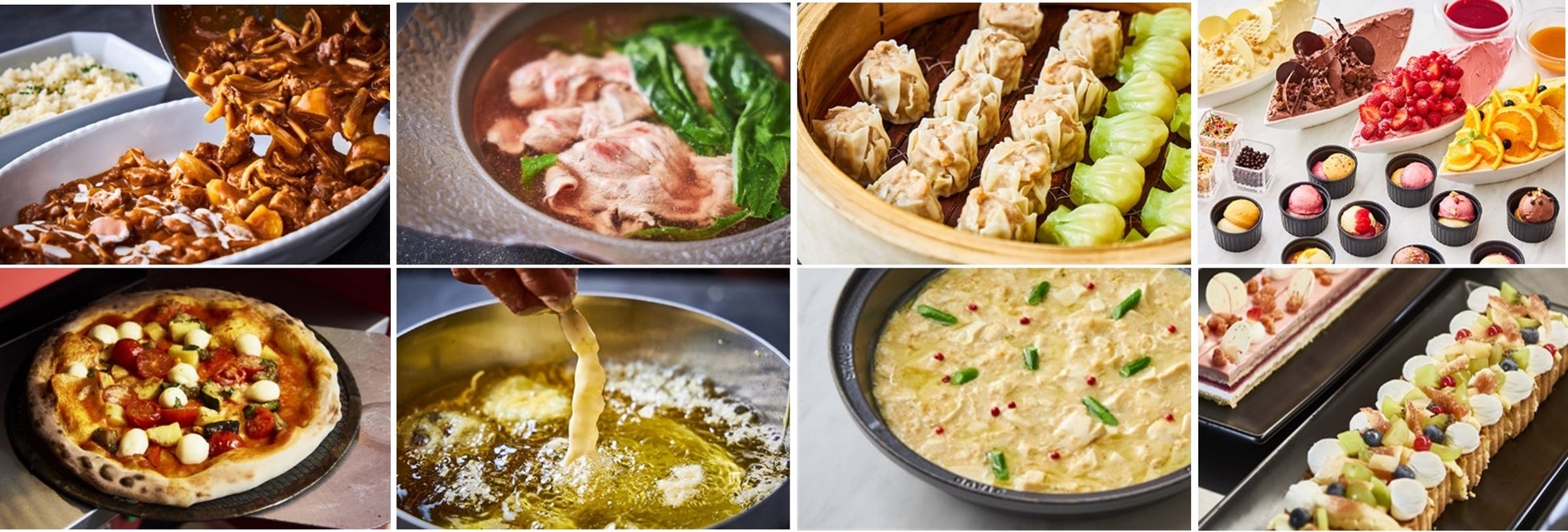 西洋料理では、クロスダインおすすめの「ビーフシチュー」や「ビーフストロガノフ」にバターライスを合わせてお楽しみください。自慢のピザ窯で焼き上げるピザもお見逃しなく。日本料理では、シェフがその場で調理パフォーマンスを繰り広げる、旬の貝を使用した特製“海鮮貝だし汁”で味わう「野菜と仔羊のしゃぶしゃぶ」や、揚げたての天麩羅をお楽しみください。中国料理では、香辛料特有の辛味の中にあるコクと旨みを追求した多彩な味覚をお届けします。クロスダインおすすめの「白麻婆豆腐」をはじめとした煮込み料理や深い味わいの炒め物、麺類などが楽しめ、目の前で蒸しあげる点心もおすすめの一品です。パティシエが作る焼き菓子や季節のジェラート、ホテルメトロポリタン伝統のコクと深みのあるバニラアイスクリームもご賞味ください。