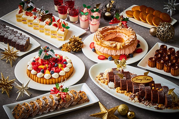 クリスマス期間のスイーツは、見た目も華やかでクリスマス気分を盛り上げてくれるアイテムを多数ご用意いたします。ホテルパティシエ特製のクリスマス定番ケーキ「ブッシュドノエル」は、チョコレートクリームをぬった軽やかなスポンジを巻き、さらに表面をチョコレートでコーティングしました。コクのある甘さのため、お子様はもちろん大人の方もご満足いただける一品になっています。フランスの伝統的なシュー菓子「パリブレスト」に苺クリームを挟み、リースに見立てた飾り付けにしてクリスマス気分を演出しました。リング状のシュー生地のサクサクした食感もお楽しみください。同じくクリスマス仕様に飾りをアレンジした「ショートケーキ」や、苺の風味香る優しい甘さの「苺の杏仁豆腐」など、心ときめくスイーツの数々をご堪能ください。