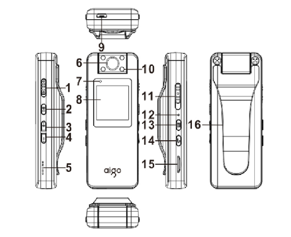 13.メニューキー :それを長押しして設定メニューに入ります。サブメニューで短く押すと、前のメニューに戻り、ビデオ/スナップショット/再生を切り替えます。