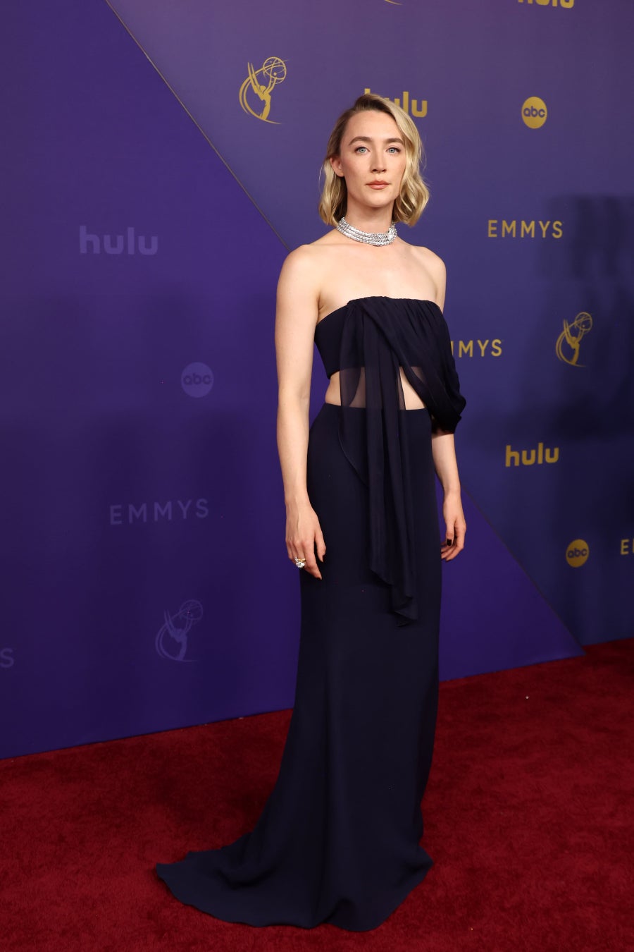 メゾンのアンバサダーのシアーシャ·ローナンは、ミッドナイトブルーのシルクのドレープトップとダブルシルクのAラインスカートにブラックのプラットフォームサンダルを合わせました。