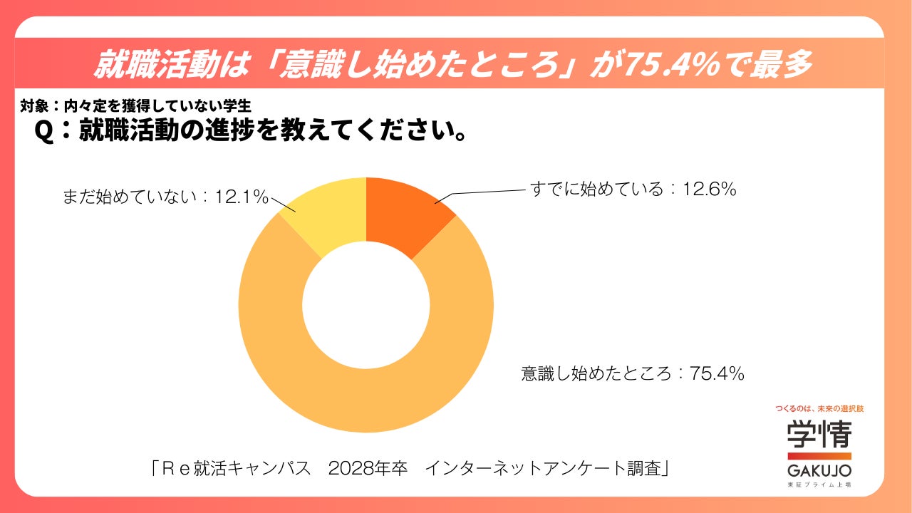 就職活動の進捗について聞いたところ、「すでに始めている」は12.6%、「意識し始めたところ」が75.4%、「まだ始めていない」が12.1%となりました。