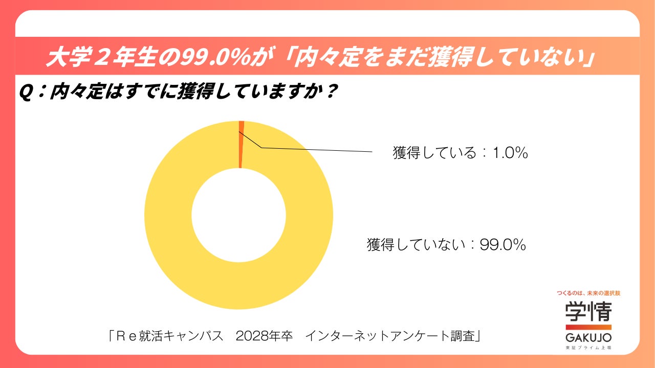 大学2年生を対象に、内々定の獲得状況について聞いた結果、「すでに獲得している」と回答した学生は1.0%にとどまり、「獲得していない」は99.0%となりました。現時点では、多くの学生にとって内々定獲得はこれからの段階であることがわかります。