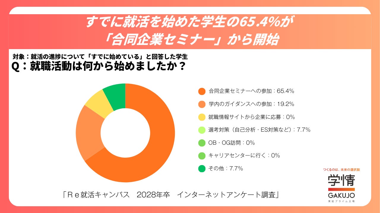 また、「すでに就職活動を始めている」と回答した学生においても、「合同企業セミナーへの参加」が65.4%で最も多い結果となりました。