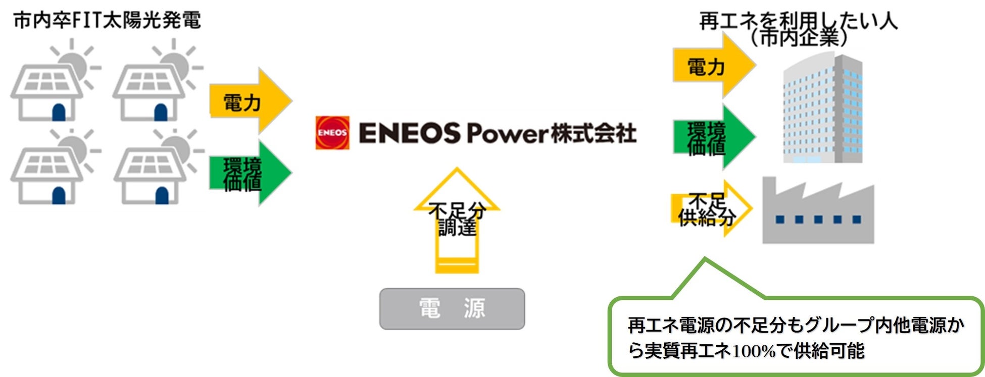 本連携協定の取組として、ENEOS Powerは横浜市内ご家庭の卒FIT太陽光余剰電力を活用し、横浜市内の需要家へオフサイトPPAによる電力供給を行うことで、再エネの地産地消を行います。不足分は、グループ内の他の電源により実質再エネ100%での供給が可能です。