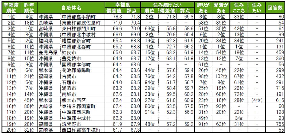 ●11位~20位では、16位宮崎県東諸県郡国富町が昨年80位から大きく順位を上げてトップ20入りしています。その他、11位福岡県古賀市(昨年21位)、15位熊本県熊本市西区(昨年45位)、19位福岡県筑紫野市(昨年28位)、20位宮崎県西臼杵郡高千穂町(昨年32位)も大きく順位を上げてトップ20入りしています。