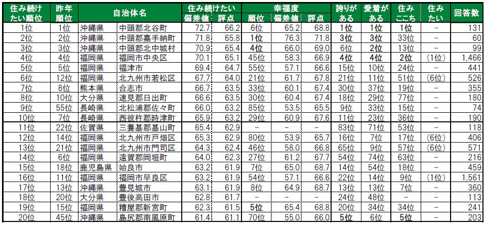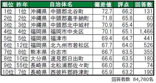 ●11位~20位では、20位沖縄県島尻郡南風原町が昨年45位から大きく順位を上げてトップ20入りしています。その他、11位佐賀県三養基郡基山町(昨年22位)、13位福岡県北九州市門司区(昨年21位)も大きく順位を上げてトップ20入りしています。