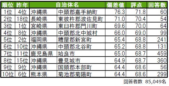 沖縄県中頭郡嘉手納町が、昨年4位から順位を上げて1位に輝きました。2位は長崎県東彼杵郡波佐見町で、昨年18位から大きく順位を上げました。3位は宮崎県東臼杵郡門川町です。トップ10のうち8つが、沖縄県・長崎県・宮崎県・福岡県・熊本県の郡部に属する「町」や「村」という結果になっています。