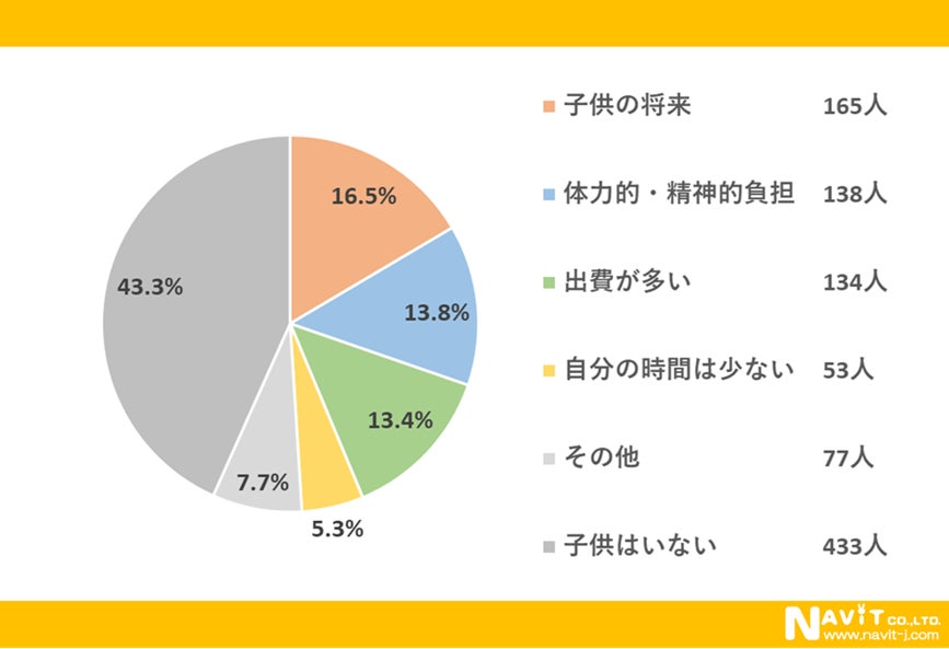 「特に子育てで困ったこと、不安だったことは何ですか?」という質問については、「子供の将来」が16.5%、「体力的・精神的負担」が13.8%、「出費が多い」が13.4%という順になりました。