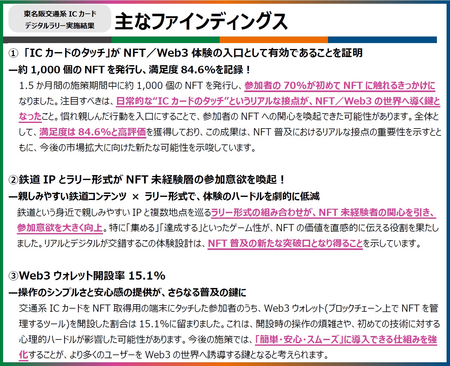 本施策では、NFTやブロックチェーン技術が実際の移動体験や日常行動と結びつくことで、生活者へのWeb3技術の浸透や社会実装に向けた現実的な足がかりとなる可能性が示されました。特に、鉄道IPと交通系ICカードを活用したデジタルラリーにおいては「交通系ICカードのタッチ」という日常的で直感的な行為が、NFTやWeb3との最初の接点、“カギ”として機能し、これまで参加のハードルが高かったブロックチェーン技術への導入を促す糸口となったことが確認されました。日常行動を入口とする設計は、NFTおよびブロックチェーンの社会実装を進めるうえで、重要な示唆を与えるものといえます。