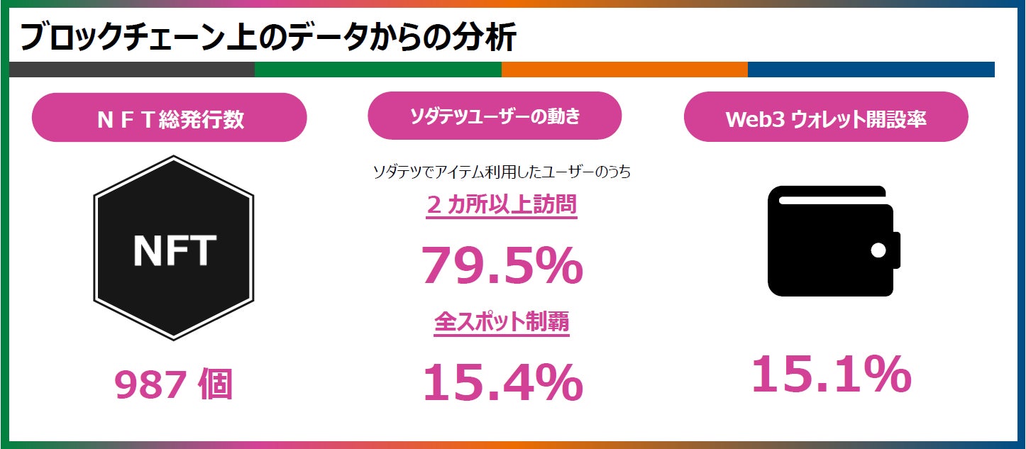 ・また、本施策で獲得したNFTは、スマートフォンゲーム「ソダテツ」上でアイテムとして使用することが可能であり、実際にゲームで活用した参加者のうち79.5%が2か所以上のスポットを訪問、15.4%が全スポットを制覇するなど、積極的な回遊行動が確認されました。この結果から、NFTを他サービスと連携させて“使える場”を提供することで参加者の行動意欲を高める効果があることが示されています。