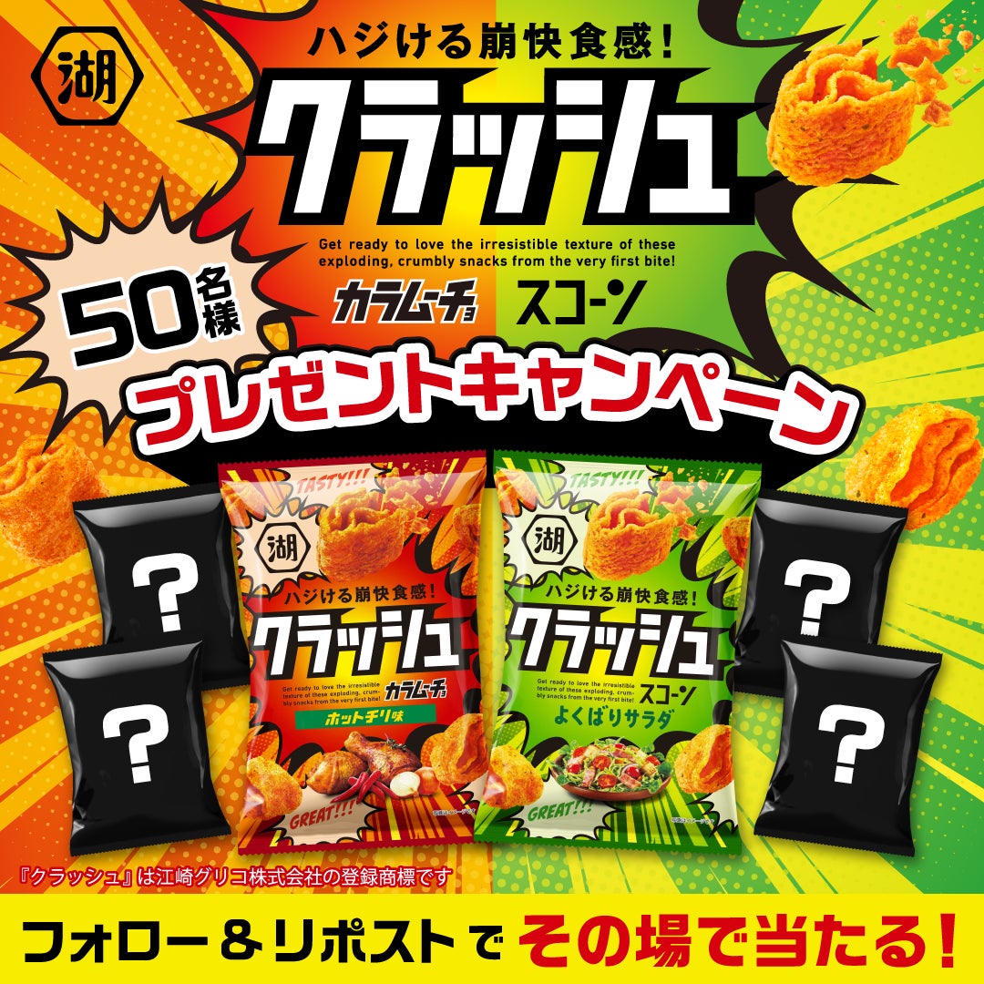 フルリニューアルした「クラッシュカラムーチョ」「クラッシュスコーン」の発売を記念して、当商品をみなさまにもっと知っていただきたい、食べていただきたいとの思いから、新商品をプレゼントするキャンペーンを実施します。ぜひご参加ください。