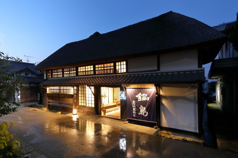 銘酒『鍋島』の酒蔵が営む1日ひと組限定の宿『御宿 富久千代』(佐賀県鹿島市)。酒蔵通りに立ち、茅葺屋根に白壁が美しい外観です。