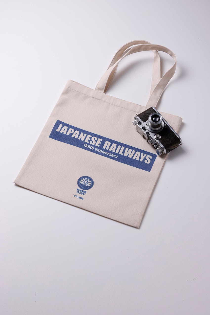 裏面は鉄道150周年を表す英文字と、蒸気機関車の動輪を象ったオリジナルのロゴマークを落ち着いた青色で刷り込みました。