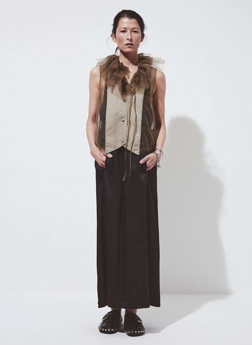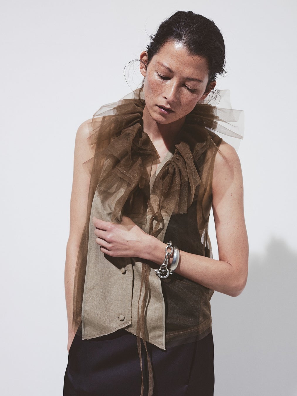 リネン混素材とチュールをドッキングさせたミックスマッチが新鮮なベストは、裏返しで着たような遊び心のあるデザインがポイント。付属のチュールティペットは様々なアレンジが可能です。