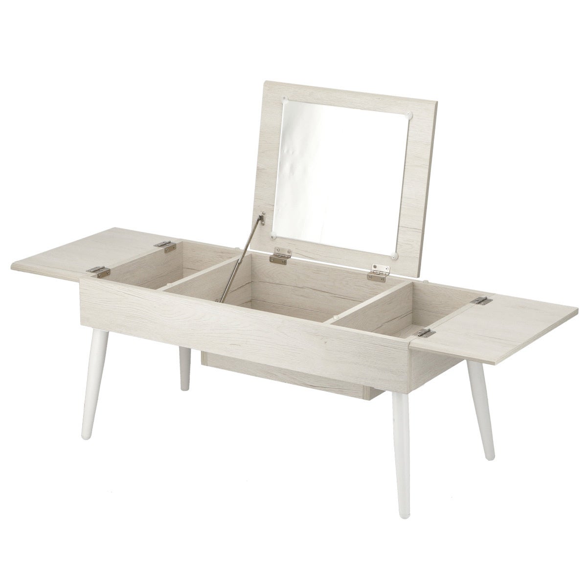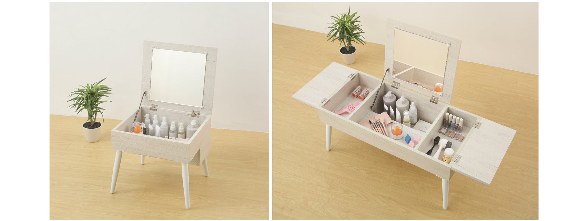 ミラーを閉じれば、シンプルなテーブルとして使用可能です。装飾を抑えたデザインで、さまざまなテイストのお部屋に自然になじみます。カラーはホワイトウォッシュを採用し、明るくやわらかな印象に仕上げました。