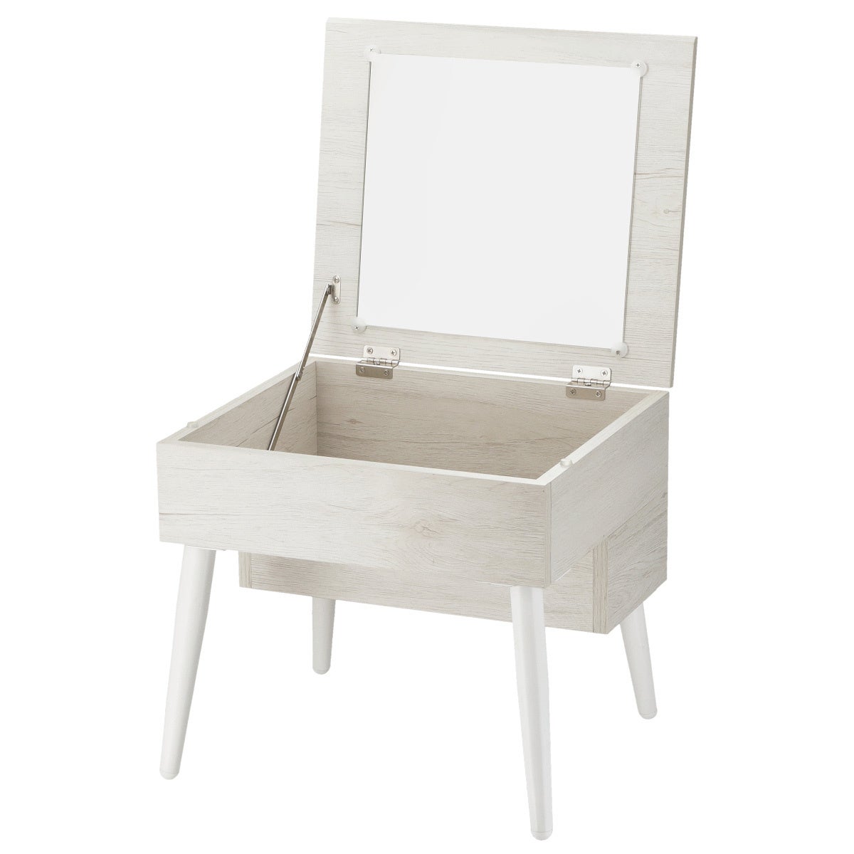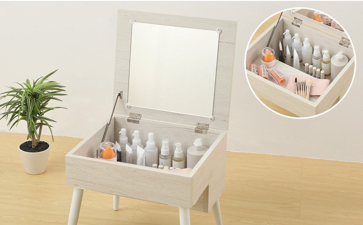 天板を開けばミラーとして使え、身支度やメイクにもぴったり。天板内部には、コスメや文房具、小物類をたっぷり収納できるスペースを備えています。仕切りを設けることで、中身を整理しながら収納できることもポイントです。