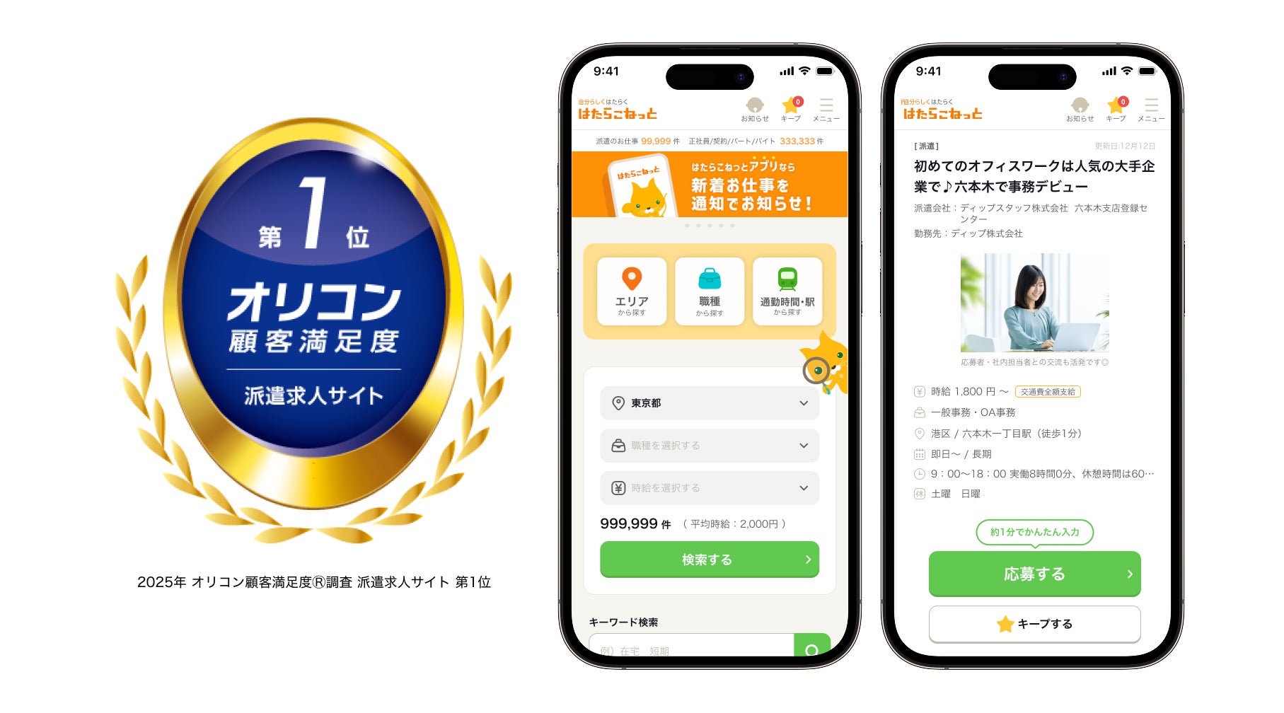 ディップ株式会社(以下「当社」)の運営する総合求人サイト「はたらこねっと」が、オリコン株式会社の発表する2025年 オリコン顧客満足度®調査の派遣求人サイトランキング(以下「本ランキング」)で3年連続満足度総合第1位を獲得いたしました。