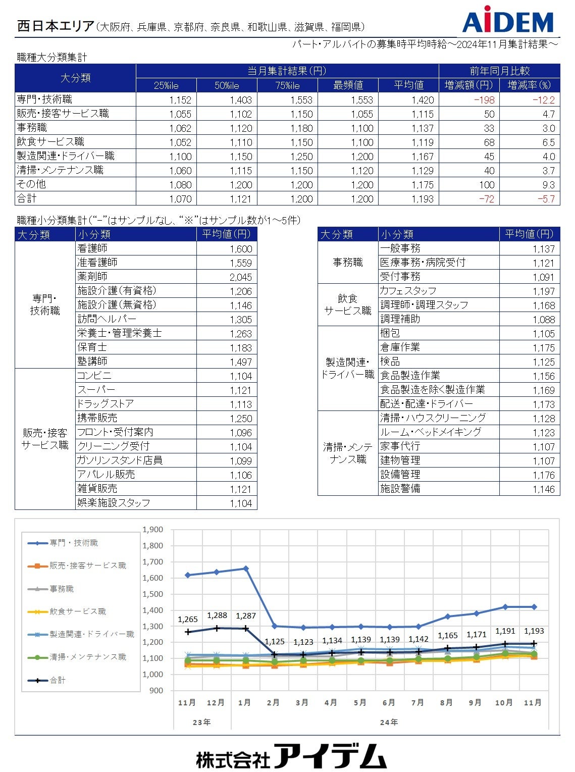 職種大分類別の平均時給は、「専門・技術職」1,402円(前年同月比211円減)、「製造関連・ドライバー職」1,179円(同41円増)、「事務職」1,160円(同41円増)、「清掃・メンテナンス職」1,138円(同42円増)、「飲食サービス職」1,137円(同64円増)、「販売・接客サービス職」1,127円(同53円増)の順で、前年同月比でプラスが5職種、マイナスが1職種となった。府県別の平均時給は、大阪府1,237円(前年同月比129円減)、京都府1,169円(同47円増)、兵庫県1,165円(同51円減)の順となり、前年同月比でプラスが1府、マイナスが2府県となった。