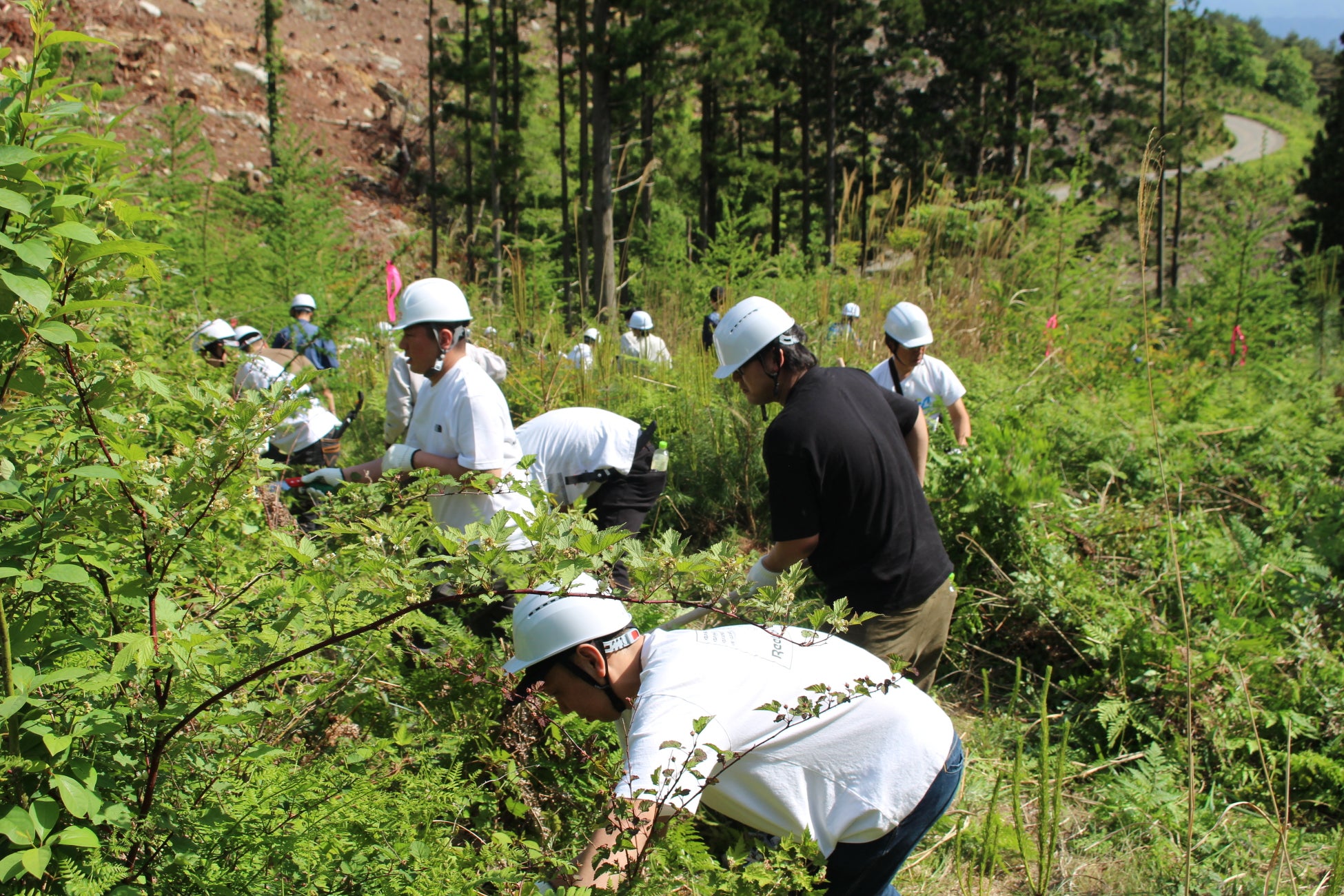 その後、陸前高田市森林組合のご指導のもと、植栽木への印付け、植栽したカラマツ、ベニヤマボウシの周りの坪刈り、ベニヤマボウシのツリーシェルター除去、実生マツ、雑木等の除伐などの活動に従事しました。