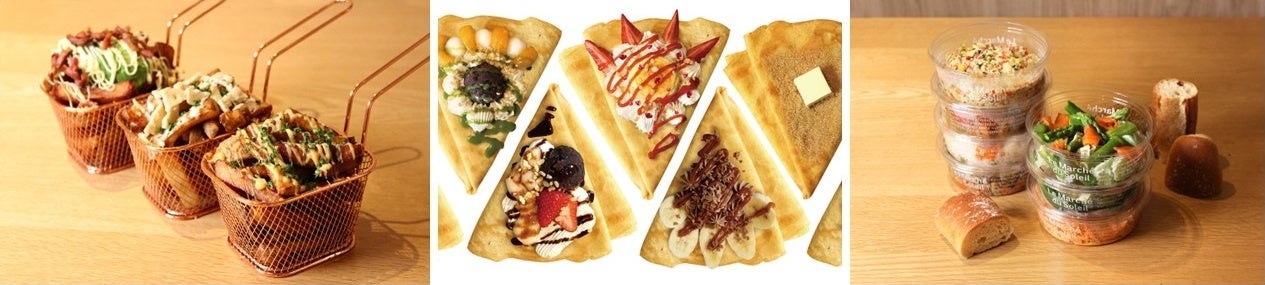テイクアウトメニューでは、クレープやフレンチフライ、お惣菜、パンも販売いたします。色鮮やかなタルトや生ケーキ、人気の焼き菓子も勢揃いします。皆さまのライフスタイルに合わせて、ぜひご利用ください。